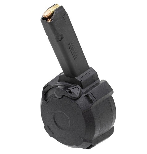 NOTE: The manufacturer does NOT recommend using this magazine in pistol caliber carbines. Gen 1-3 pistols are recommended to have a new OEM mag release installed to support the added weight of the D-50. Gen 4 pistols will require an aftermarket metal mag release for optimal use. Installing a new recoil spring assembly is recommended to ensure reliable feeding. Variations between individual firearms may result in an extra power spring being needed for best performance.